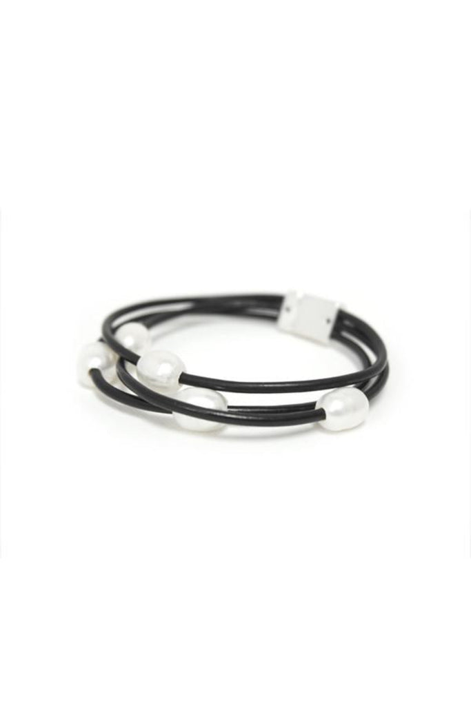 Decorate your wrist with this layered bracelet with genuine fresh water pearls on a leather cord featuring a matte silver magnetic closure.